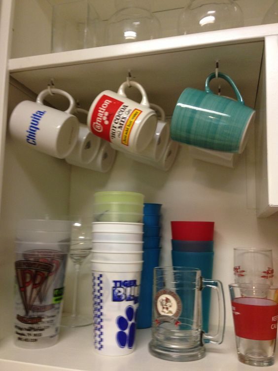 И еще один отличный пример. Слишком узкий шкаф для посуды, где всего не уместить? Прикрутите к полкенесколько крючков, и у вас появится еще один посудный ряд, для кружек.