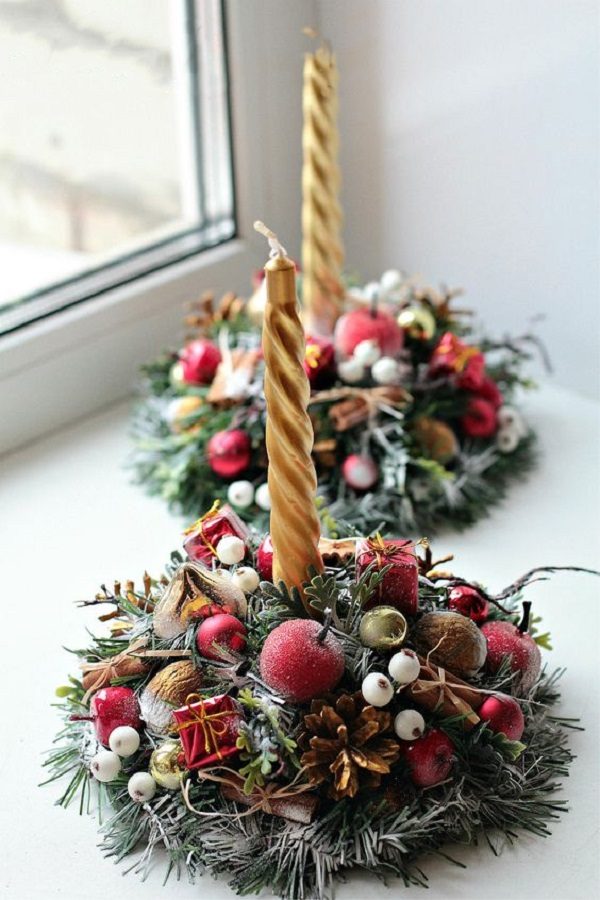 Просто и оригинально можно сделать подсвечник, используя крупные шишки и мох, а дополнить композицию можно добавив ягодки, елочные шары и декоративные звездочки. Всё зависит только от твоей фантазии!