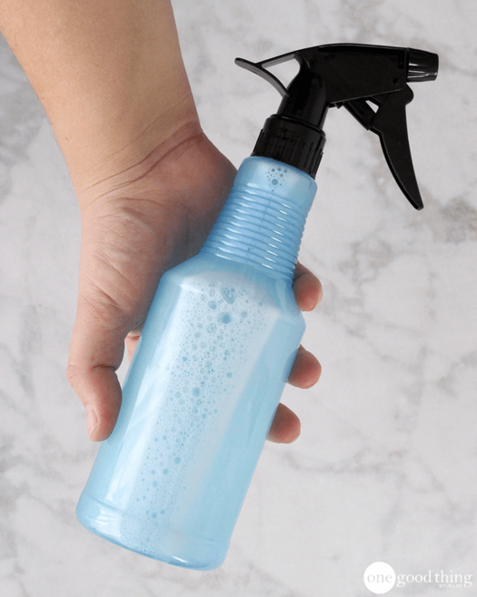Вам снова понадобится бутылка с распылителем. Смешайте воду, жидкое кастильское мыло и эфирное масло апельсина. Перед употребление — взбалтывайте.