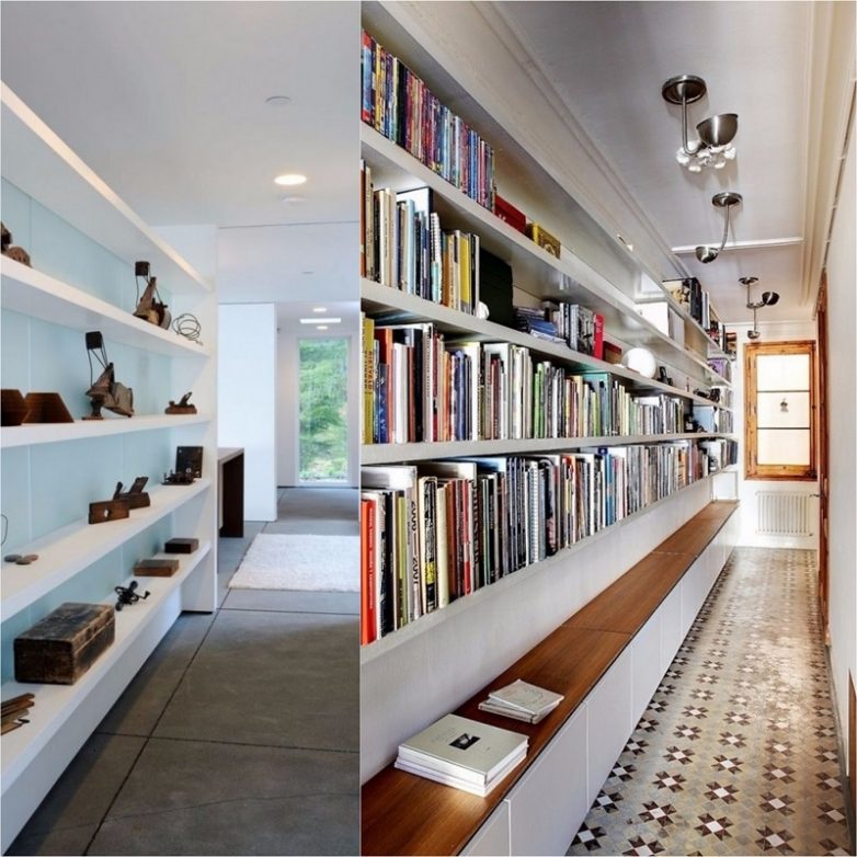 Что может быть прекраснее, чем персональная библиотека или выставка произведений искусства? Именно коридор можно превратить в площадку для вдохновения и умиротворения. Книжные шкафы занимают мало места, также можно использовать для книг подвесные полки.