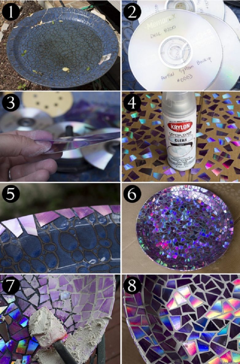 Зеркальная мозаика. С помощью ножниц или плоскогубцев разломай диски на мелкие фрагменты. У тебя получатся миниатюрные осколки, которыми можно декорировать любые поверхности: рамки, цветочные горшки, предметы посуды и мебели. Что бы ты ни сделал, это будет сиять всеми цветами радуги.