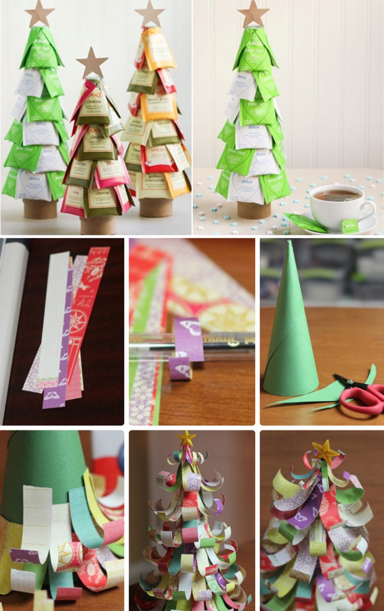 Их можно сделать из разных материалов: сизали, веревки, пуговиц, пластика. Красиво смотрятся на праздничном столе и в разных уголках комнаты. Оригинальная елочка из чайных пакетов удивит друзей даже в офисе.