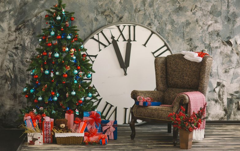 Акцентируй внимание на главном элементе композиции. Это может быть елка, сани, часы, камин или кровать. В дополнение к ним возьми кресло, коробки с подарками. Мелкий декор расставляй с умом, ведь переборщить очень легко.