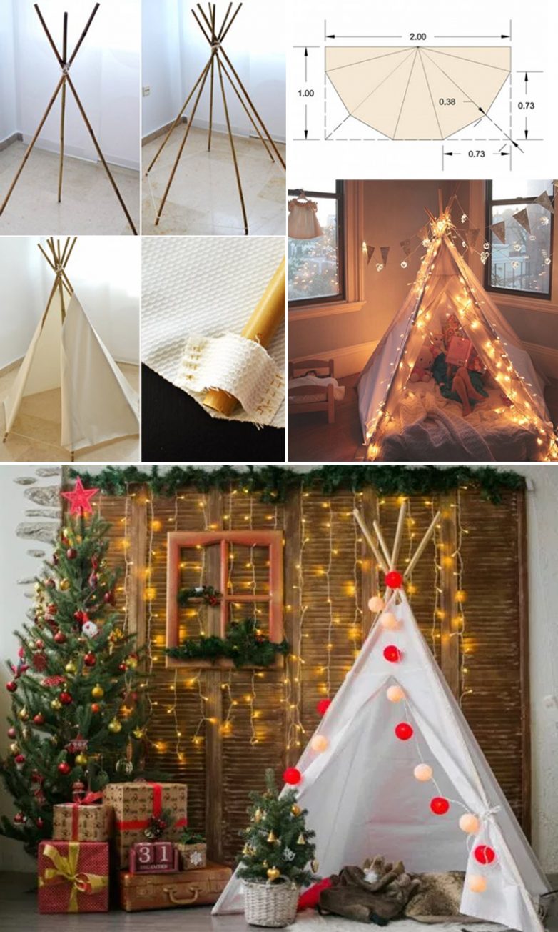 Смотри простую инструкцию, как сделать детский вигвам. Он идеально впишется в новогодний сюжет. После праздников подари его детям, радости не будет предела!