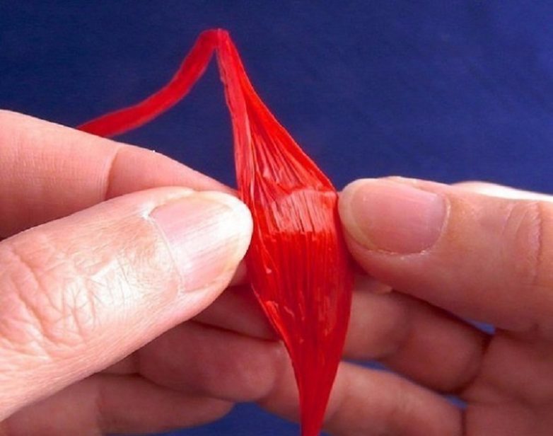 Для этой вышивки тебе потребуются обычные полиэтиленовые пакеты разных цветов, которые нужно порезать на полоски и вытянуть, чтобы получилась нить. Слишком сильно вытягивать не стоит, ведь нить должна быть достаточно грубой.