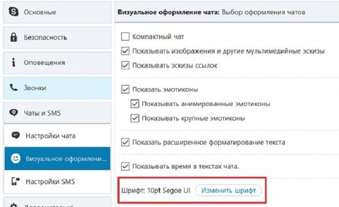 По умолчанию тексты в Skype набираются 8-м кеглем, который неудобно читать при плохом зрении. Изменить размер шрифта можно так: «Инструменты» — «Настройки» — «Чаты и SMS» — «Визуальное оформление» — «Изменить шрифт».