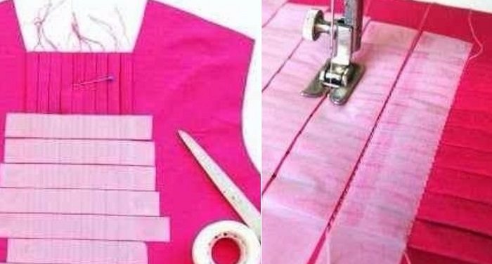 Таким способом можно легко и ровно уложить и пришить складки. Чтобы складки не разбежались, их следует скрепить малярным скотчем, а затем пришить по поперечным проталинкам между полосками лент.