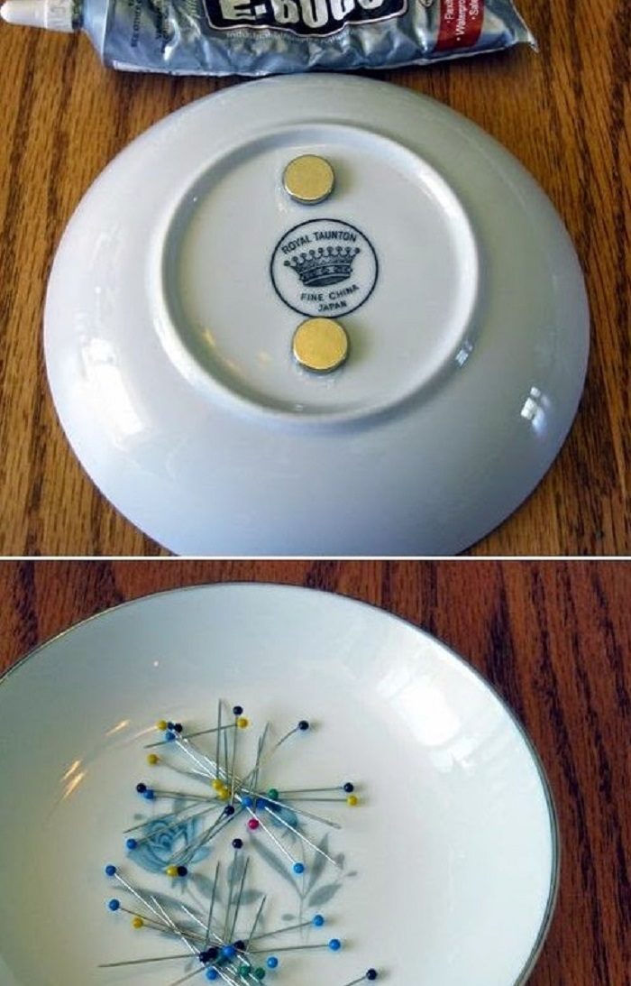 Чтобы булавки не рассыпались по столу, достаточно приклеить пару магнитов на обратную сторону блюдца.