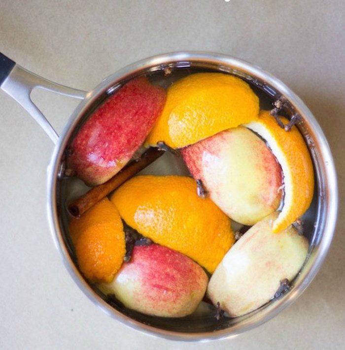 Если вы пригласили гостей встретить праздник на даче, где есть камин или печь с открытым огнем, поставьте на огонь сотейник или горшочек среднего размера, наполненный кусочками яблок, кожурой апельсина, 2 палочками корицы и водой. Когда вода закипит, дом наполнится ностальгическими ароматами детства и вашим гостям не захочется от вас уходить. Только следите, чтобы вода не выкипела и содержимое горшочка не пригорело.