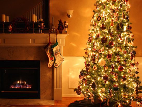 Рождественская елка, как правило, наряжается в большом доме, устанавливается возле каминного портала, который, в свою очередь, тоже украшен. Санта спустится по дымоходу и наполнит разноцветные чулки-мешочки подарками для детишек и взрослых. В такой рождественской ели самое главное — ее свечение, так что не жалейте гирлянд. Разноцветные огоньки создают предпраздничное настроение.