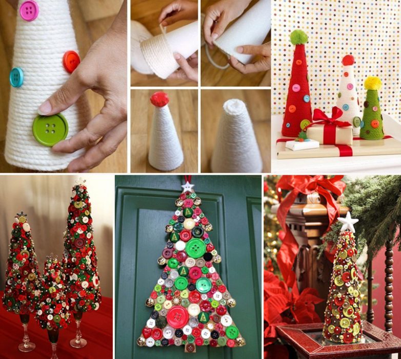 Разноцветные елочки из пуговиц можно сделать частью открытки, панно или собрать их в виде топиария.
