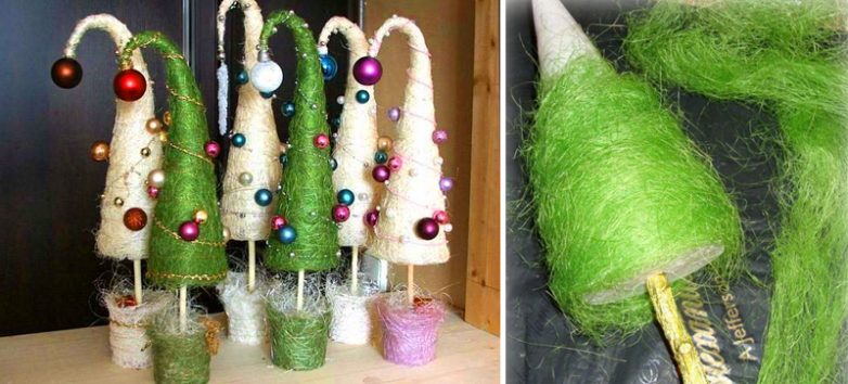 Шпагат или бечевку обмакни в клей и плотно обмотай ими картонный конус. Дай высохнуть, украшай мелкими бусинами, бисером, стразами, легкими игрушками.