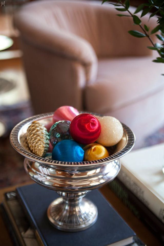 Положите что-нибудь «новогоднее» в большое блюдо, вазу или кашпо. Можно использовать только елочные украшения или добавить к ним шишки, грецкие орехи или фундук.