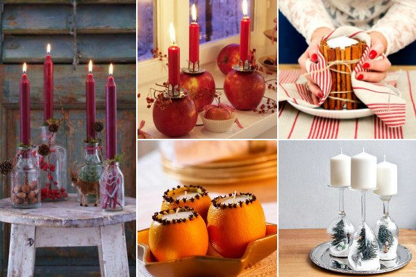 Яблоки, пожалуй, наша любимая идея. Они такие яркие, праздничные и так красиво смотрятся в сочетании с еловыми ветками и огоньками свечей. Вырежьте в яблоке небольшое углубление, чтобы внутрь поместилась чайная свечка.