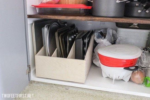 Вы до сих пор храните их в стопке? Это не удобно: занимает слишком много места, и чтобы достать нижний противень, например, приходится доставать всю тяжелую стопку.