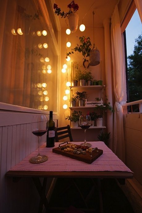 Откидной столик, который крепится к стене, в сложенном виде превращается в небольшую полку. Также пара складных стульев и, конечно, светодиодная гирлянда. Она играет здесь главную роль. Кстати, если балкон не застеклен, можно использовать шторки, чтобы создать более интимную обстановку. Идеально подойдут шторки от уличных тентов, которые не боятся дождей и сырости. Если их не оказалось, можно использовать простую душевую штору.