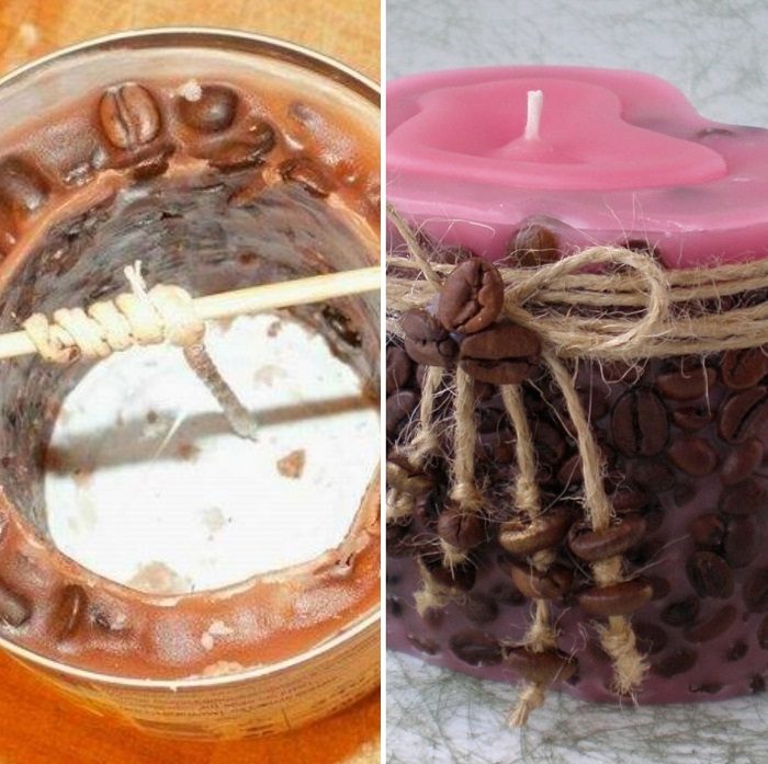 Залей кофейные зерна небольшим количеством парафина, чтобы они не всплыли, и немного остуди. Когда этот слой парафина застынет, растопи оставшуюся часть парафина и залей форму доверху. Когда свеча затвердеет, вынь ее из формы.