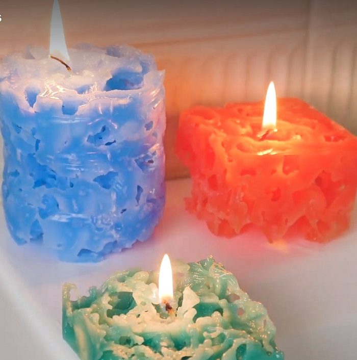 Для создания этой необычной свечи нужно взять пустую пластиковую бутылку, использовав ее как форму для будущей свечи, внутрь положить готовую свечу, заранее обрезав ее по размеру формы. Затем обложи форму льдом либо воспользуйся растопленным воском и готовым фитилем, как показано на изображении.