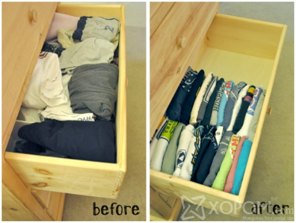 Если вещи собирать в ящике вертикальной стопкой, экономится ровно половина ящика. Да и одежда сразу вся на виду.