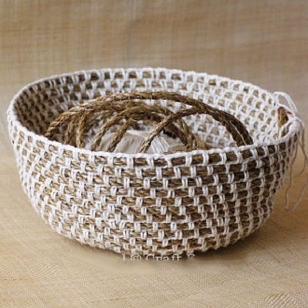 Верхний ряд веревки обвязывай не полностью, оставляя ручки. Также можно добавить еще один слой веревки сверху, закрепив края этого кусочка пряжей. А еще место крепления ручки стоит дополнительно укрепить плотной вязкой.