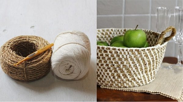 Красивую вместительную корзинку, в которую можно положить любые вещи, сделать очень просто. Всё, что вам понадобится, — это длинная веревка, пряжа и вязальный крючок.