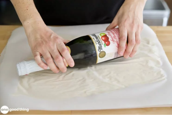 Накройте тесто слоем бумаги для выпекания и раскатывайте его с помощью пустой бутылки.