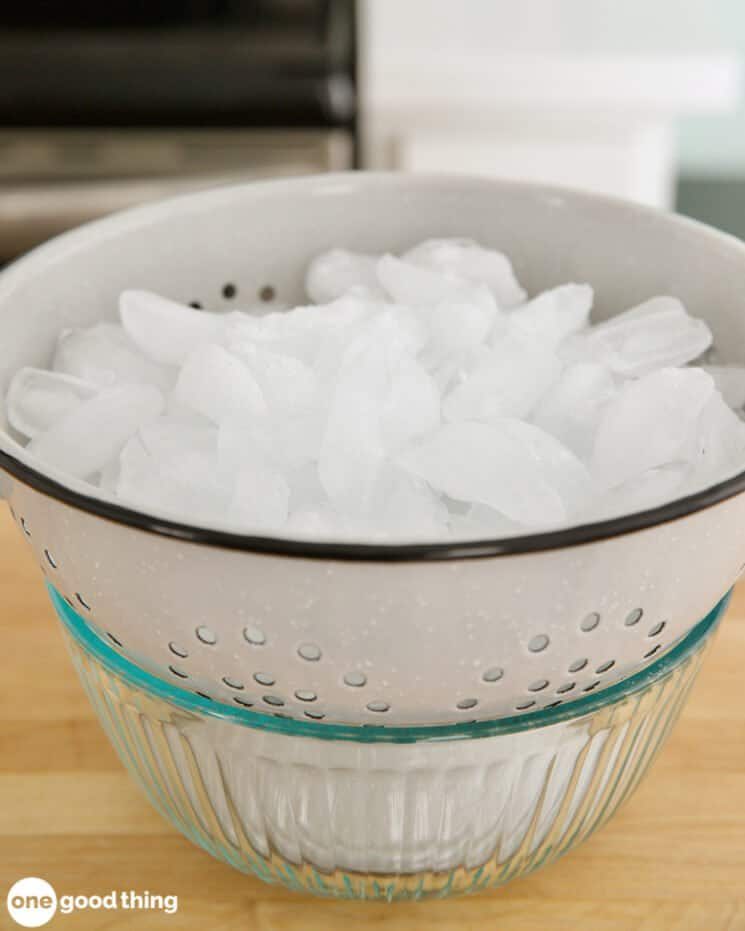 Поместите дуршлаг в большую миску, заполните ее льдом и поставьте на лед напитки. Растаявшая вода будет стекать в миску, и никому не придется вылавливать напитки из ледяной воды.