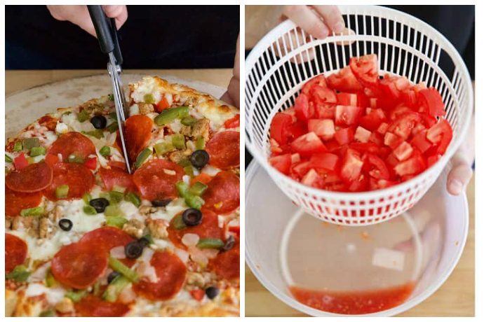 Чтобы убрать из томатов лишнюю жидкость и семена, используйте сушилку для овощей. Разрежьте томаты, поместите в сушилку и прокрутите. Все лишнее останется в поддоне сушилки.