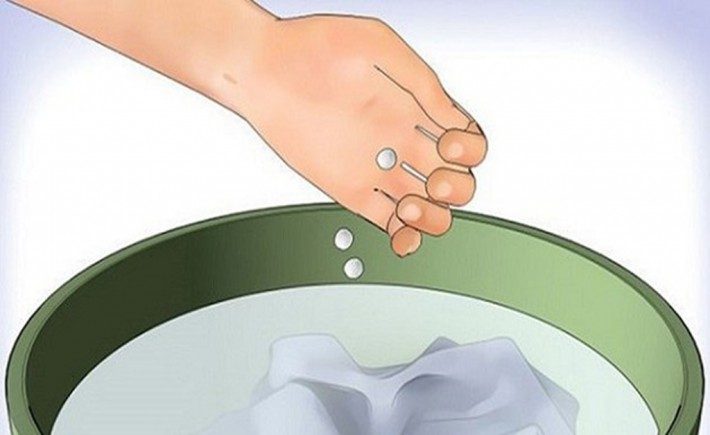 Раздавите в ступке или на доске 5 таблеток аспирина по 500 мг. Добавьте их в тазик с горячей водой и замочите грязную одежду на всю ночь.