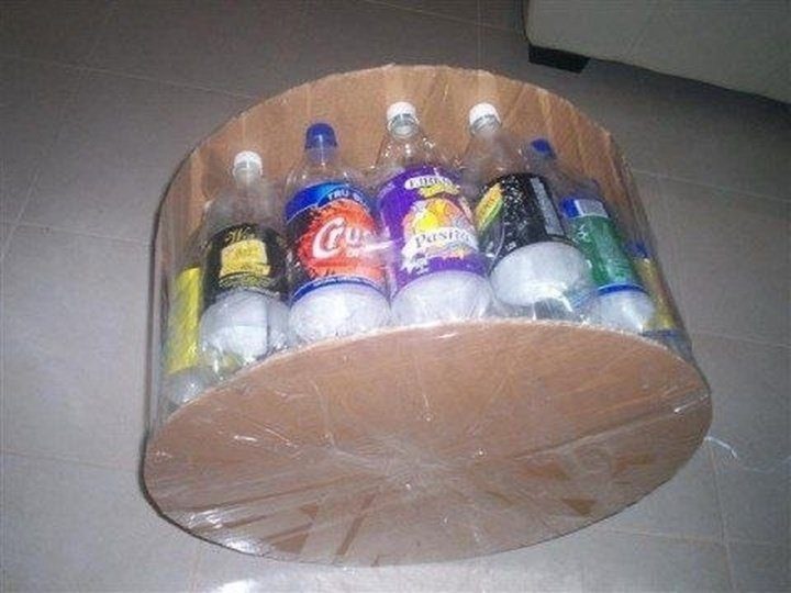 Когда все бутылки на месте, берем рулетку и измеряем диаметр дна. К этому числу добавляем 4.5 см и вычерчиваем на картоне два одинаковых круга полученного диаметра. Сразу по ним сделаем выкройку для оформления дна и седушки: 2 круга из синтепона, 2 круга из отделочной ткани.