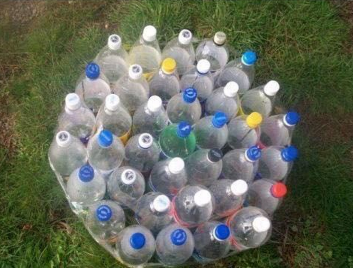 Сначала нужно скрепить между собой бутылки. Перемотайте их скотчем по две штуки, потом соедините по 4, потом по 8 и так до самого конца. Если вы не уверены в прочности конструкции, можно набить бутылки пакетами или газетами.