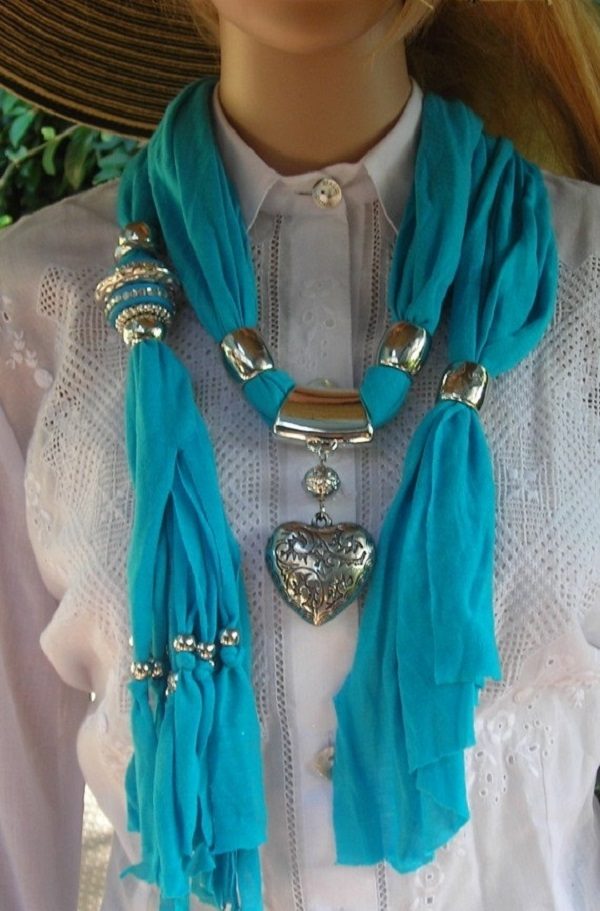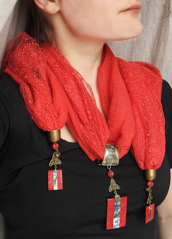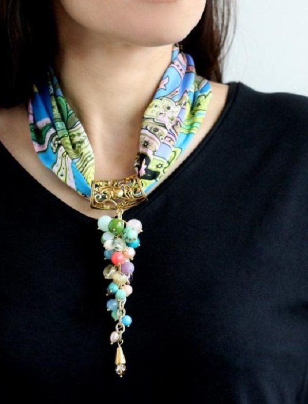 Приложив немного усилий, любая женщина может украсить шарф бусинами, изделиями из бисера, кольцами и другой бижутерией из давних запасов, которые всегда найдутся у модниц.