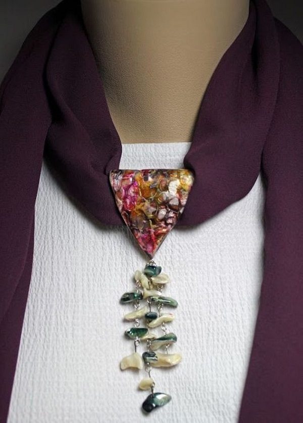 А если ты умеешь работать с бисером или являешься счастливой обладательницей бисерных украшений, можно создать элегантный и красивый аксессуар, соединив бисерную брошь с изящным рисунком и шарф из яркой однотонной материи.Кроме того, такой платок-колье может быть как зимним, так и летним, всё зависит от материала.