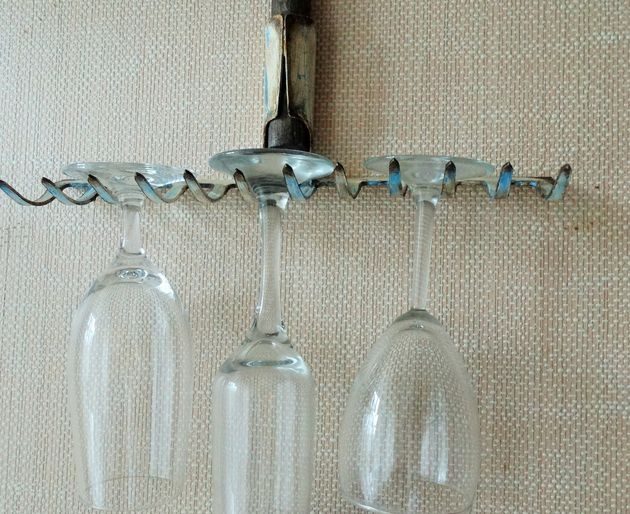 Определяем место авторской вешалки, вкручиваем саморез в стену и вешаем грабли на верхнее отверстие. Затем в нижнее отверстие вкручиваем саморез, чтобы плотно зафиксировать вешалку на стене. Отпиливаем или отламываем от черенка часть длиной примерно 20 см. Ошкуриваем и покрываем ее любой пропиткой, чтобы проявилась фактура дерева, и вставляем в крепление граблей.