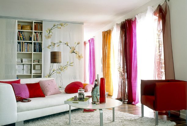 Толстые бархатные портьеры погружают гостиную в полумрак и почти сразу собирают всю пыль в вашем доме. Как правило, чем массивнее мебель и оконная драпировка, тем тяжелее атмосфера в доме. Исключения, конечно, бывают, и иногда пространство требует пышной, тяжелой ткани, однако в большинстве случаев в комнате со светлыми оттенками и воздушными тканями, и вы будете чувствовать себя легкой и воздушной.