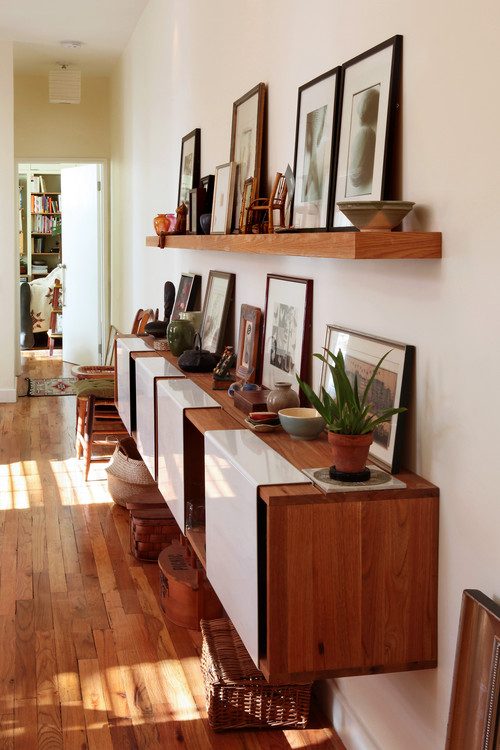 Это решение выгодно вдвойне, поскольку стеллаж — это еще и длинная полка-консоль для ваз, фотографий и безделушек.