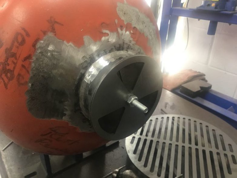 Вырезаем отверстие под дымоход и два отверстия для соединения баллонов. В этом деле мастер использовал кольцевую пилу, но лучше взять плазменный резак.