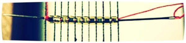 - РН с нанизанными бисеринами кладется поверх НО, затем с помощью иглы РН продевается снова сквозь бисер;