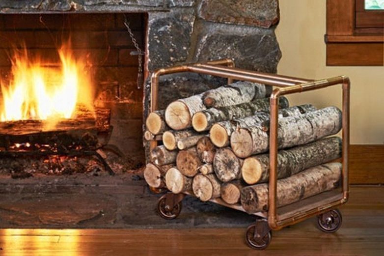 Это простой держатель, который вы можете соорудить самостоятельно с помощью сантехнических труб. Он оснащен колесами для легкой транспортировки дров к камину внутри дома.