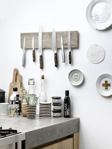 Магнитная планка для ножей: тоже очень популярный и действительно удобный прием. Во-первых, такое хранение ножей экономит место, а во-вторых, и это не менее важно, так гигиеничнее.