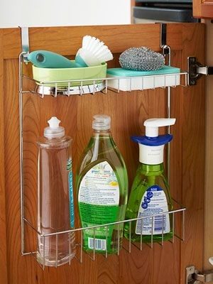 Чтобы максимально использовать пространство под кухонной мойкой, прикрутите планку для хранения средств бытовой химии, просто вешая их за рычаг пульверизатора.