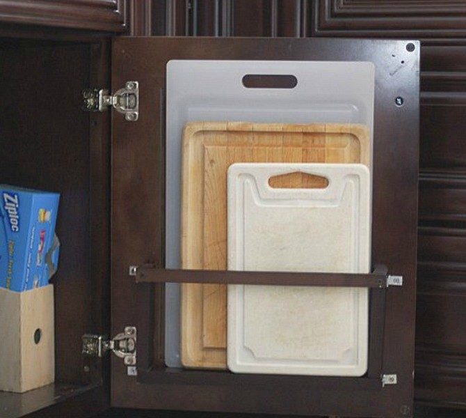 Добавьте простую узенькую полочку на любую дверцу кухонного шкафа, чтобы хранить плоские вертикальные предметы. Разделочные доски, например.