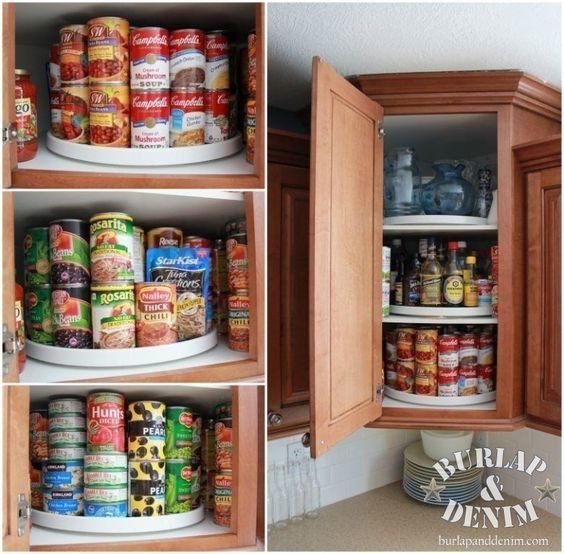 Вращающаяся подставка подойдет для заполненных вплотную шкафчиков. Так вам будет удобнее доставать нужную приправу или крупу. Не придется выкладывать все содержимое шкафа на стол, чтобы добраться до нужного ингредиента.