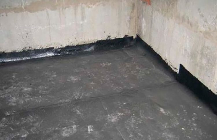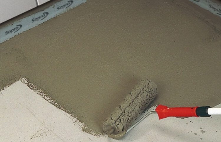 Перекрытие очищают от мусора и пыли без увлажнения поверхности. Как и при большинстве ремонтных операций, первый слой — грунт, обеспечивающий необходимую адгезию мастики с основанием. Работают валиком, выдерживают рекомендованное производителем время на высыхание.