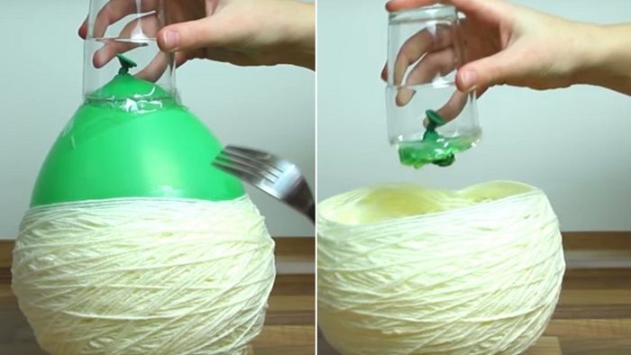 Далее переверни заготовку и с помощью острых зубцов вилки или любого другого острого предмета — сдуй шарик. Вот и всё, заготовка под корзину — готова.