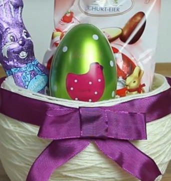 Для того, чтобы украсить корзину воспользуйся атласной лентой. С помощью термоклея закрепи ленту по периметру корзины, а также сделай по центру бант.Я оставила корзину без ручки, так удобнее складывать в нее пасхальные сладости. Однако при желании ее можно дополнить ручкой, сделанной из проволоки и ниток. Прикрепить ручку к корзинке можно при помощи того же термоклея.