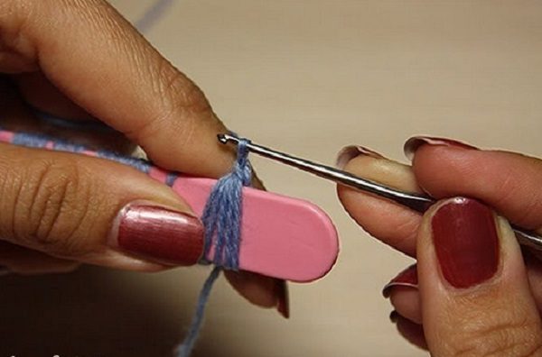 Вытяни петлю и перенеси работу на толстый крючок или палочку от мороженого. Сделай на вспомогательном крючке 15 вытянутых петель.