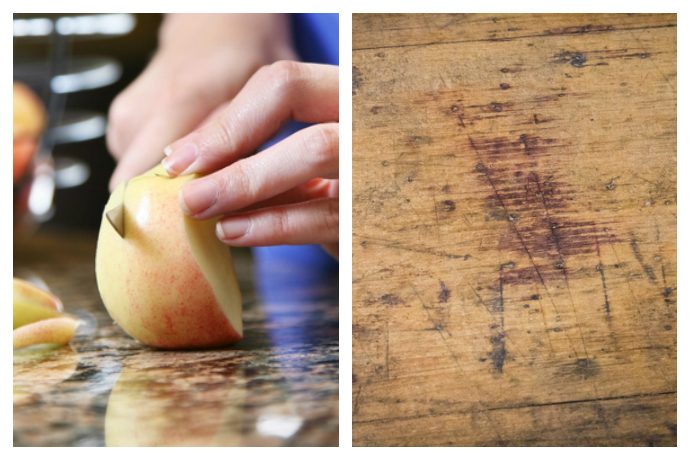 Нас с детства учили: «Не режь на столе!» Ни одна столешница этого не выдержит, поэтому и существуют разделочные доски. Также необходимо обращать внимание на вертикальные подставки для ножей. Если вставлять длинные ножи в несоответствующие отверстия, они будут касаться столешницы, оставляя царапины и сколы.