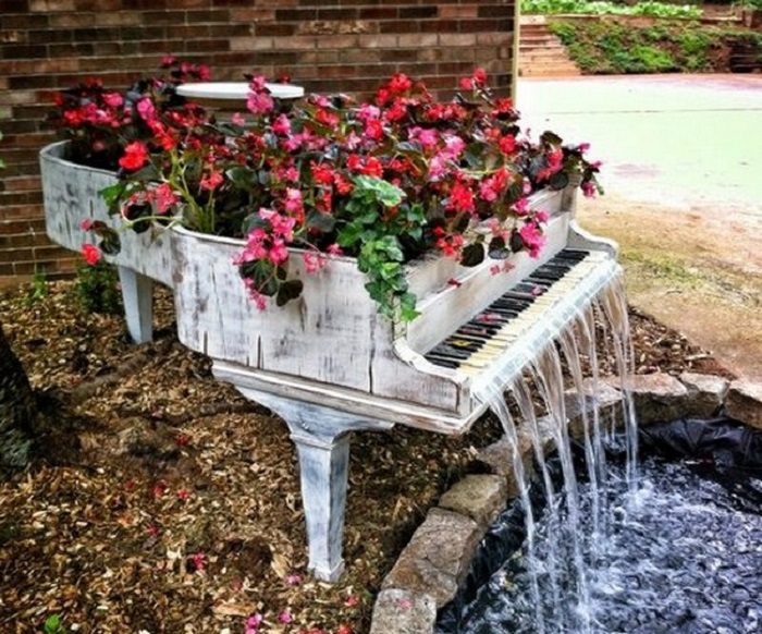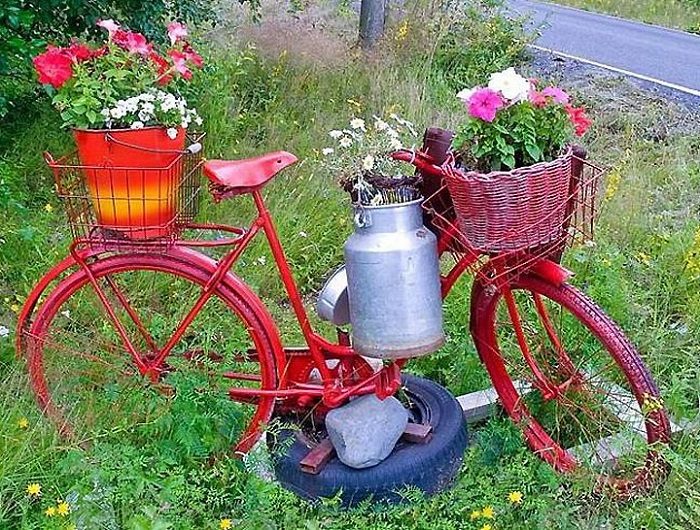 А можно использовать поломанный велосипед и поставить на него емкости с растениями, прочно закрепив их на руле и багажнике. Лучше выбирать вьющиеся петунии.