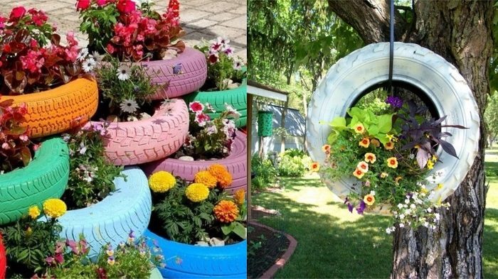 В гараже любого автолюбителя обязательно найдется пара-тройка покрышек, отслуживших свое. Самый «ленивый» вариант для клумбы из покрышек своими руками — это выбрать место поровнее, уложить покрышку, наполнить ее плодородным грунтом и высадить внутрь цветы.А чтобы добавить клумбе привлекательности, ее можно покрасить в понравившийся цвет, ведь авторезина отлично держит краску!